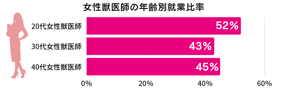 20代の女性獣医師の数は男性を上回り、約52%の構成比になっています。それが30代になると、約43%まで下がってしまいます。これは恐らく女性獣医師が家庭と仕事を両立する局面になった際、家庭に入ってしまうケースが多いからではないかと推測します。まだまだ動物病院はライフワークバランスをとりにくい業界だと言えます。