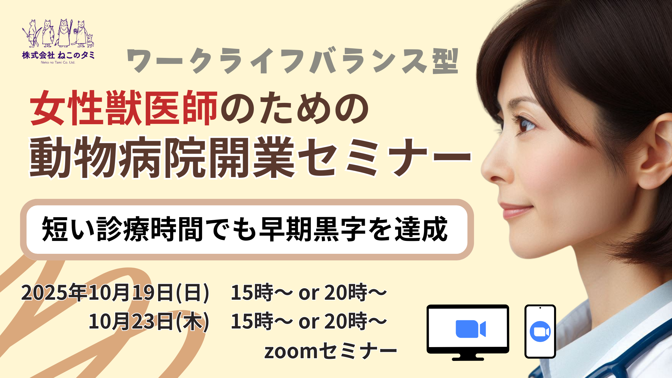 今回のセミナーでは、実際に開業を経験した女性獣医師の開業モデルをご紹介しますので、ぜひご参加ください。